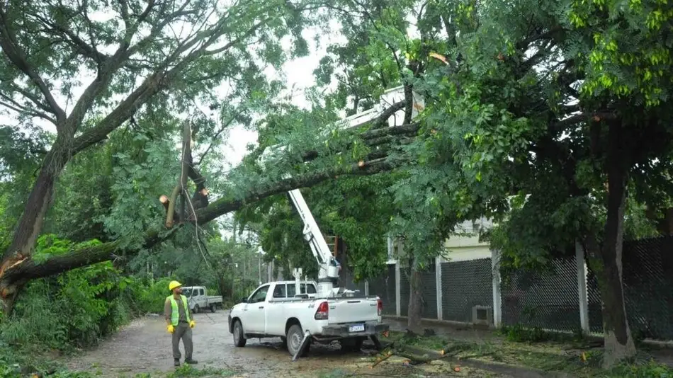 Barrio Bajo La Viña Por las lluvias, cayó rama de árbol de gran dimensión Acumuló mucha agua por su corteza, lo que provocó la fractura. Se precipitó sobre otra especie.Cuadrilla municipal trabaja todo el año, atendiendo situaciones de riesgo y realizando monitoreo.