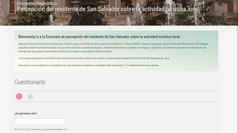 Se trata de 17 preguntas y según precisan "te llevará solo unos minutos hacerla, siendo muy valioso tu aporte para el desarrollo turístico de San Salvador de Jujuy. Apreciamos tu participación y te agradecemos que dediques un tiempo a completar este cuestionario. Tu colaboración es muy valiosa". Ya aparece en un link bien visible de la página dipec.jujuy.gob.ar pero también se anunció que habrá encuestadores en la calle y un QR.