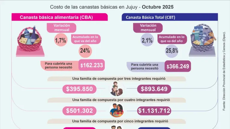 Con estos datos se puede calcular que, en diez meses, es decir el período comprendido entre enero y octubre de este año, la CBT en Jujuy aumentó su valor $211.801. Si la comparación es interanual, la diferencia es de $263.947.