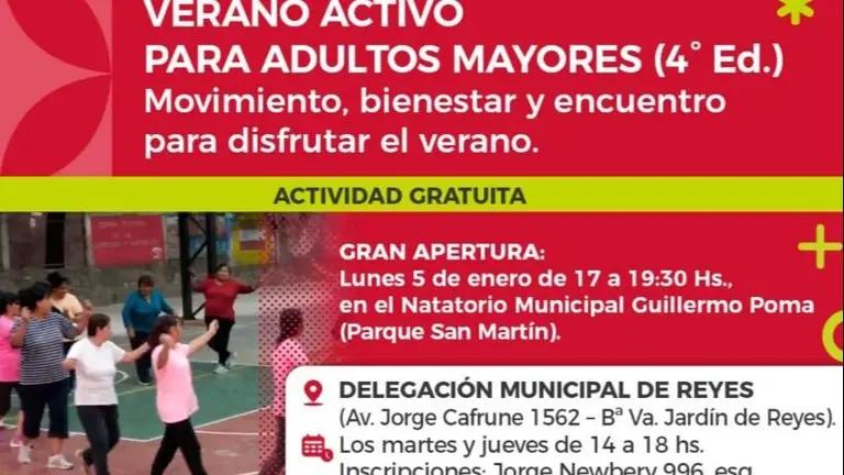 La directora de Adultos Mayores, Mirta Humacata, destacó: "Comenzamos el 2026 con la cuarta edición del Verano Activo exclusivo para adultos y adultos mayores. Estamos descentralizados en Capital, en Alto Comedero, Centro y en el distrito Oeste". Asimismo, informó que "los interesados se tienen que acercar a las oficinas de calle Jorge Newberry 996, allí les brindaremos toda la información; en la Estación Saludable; y en el CPV Santa Ana de Alto Comedero".