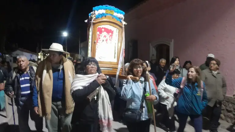 Finalizada la misa de despedida oficiada por el párroco Ricardo Rivero junto al vicario parroquial, las bandas de sikuris iniciaron la larga peregrinación saliendo desde el templo por calle Lavalle y alejándose del pueblo por la Rivadavia hasta la Casanova, donde la imagen fue cubierta luego de un breve descanso.