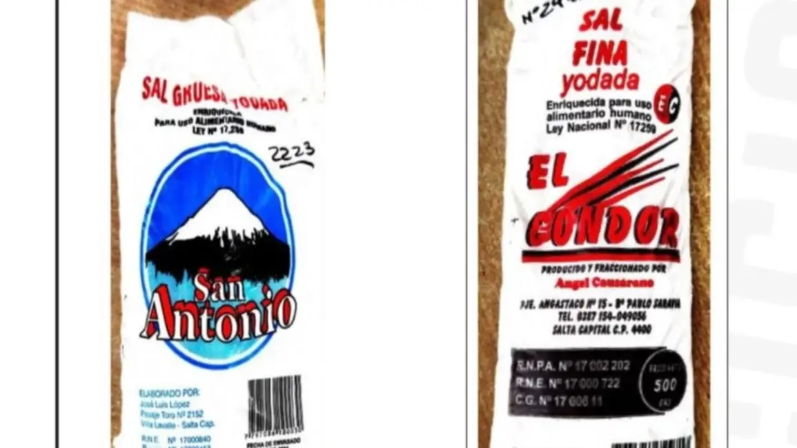 Sal fina yodada "El Cóndor", enriquecida para uso alimentario humano Ley Nacional N°17.259. Producido y fraccionado por Ángel Causarano Pje. Angastaco N°15 barrio Pablo Saravia, Salta Capital. Peso neto 500 gr. RNE 17000722 - Rnpa 17002202.