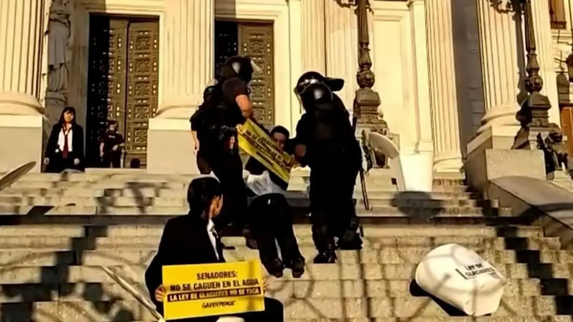 Un grupo de activistas de Greenpeace fue detenido en la explanada del Congreso de la Nación, durante una manifestación contra el proyecto de reforma de la Ley de Glaciares que el oficialismo busca aprobar en el Senado.