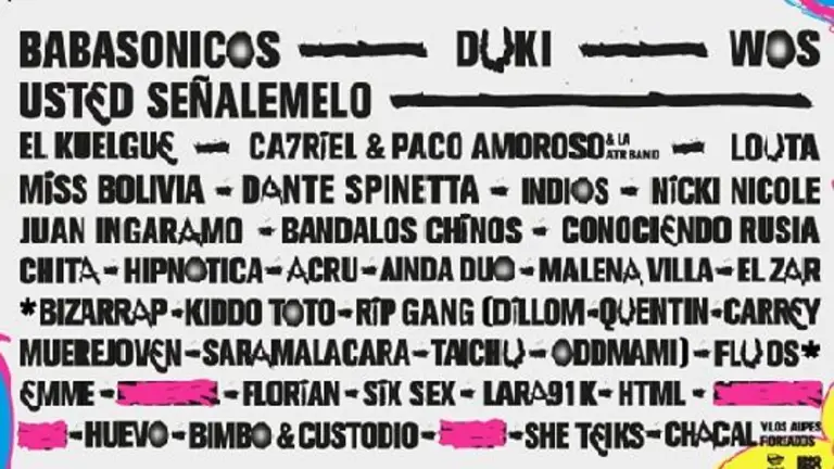 Los artistas que se presentarán en el Complejo Ferial son: Babasónicos, Duki, Wos, Usted Señalemelo, El Kuelgue, Ca7riel & Paco Amoroso, Louta, Miss Bolivia, Dante Spinetta, Indios, Nicki Nicole, Juan Ingaramo, Bandalos Chinos, Conociendo Rusia, Chita, Hipnotica, Acru, Ainda Duo, Malena Villa, El Zar, Bizarrap, Kiddo Toto, Rip Gang Dillom, Quentin, Muerejoven, Saramalacara, Taichu, Oddmami, Flu Os, Emme, Florian, Six Sex, Lara91k, Html, She Teiks, Bimbo & Custodio, Chacal y Los Alpes Floreados y Huevo.