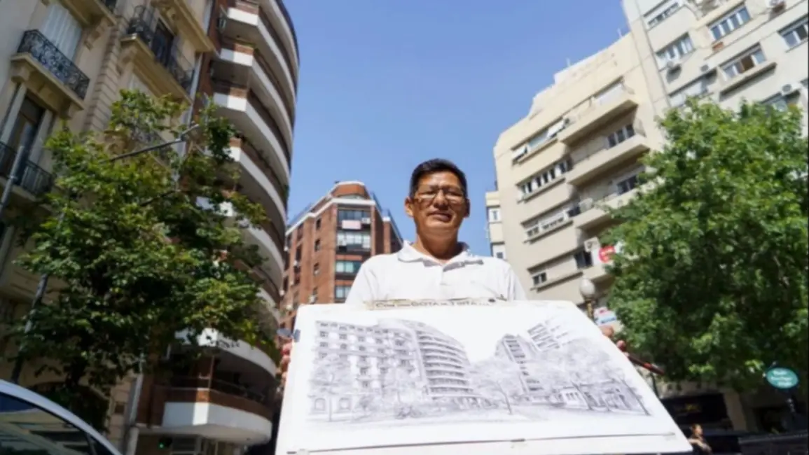 Lo explica mientras arrima líneas breves, uno al lado de la otra. La retina las juntará y permitirá ver el Palacio de Aguas Corrientes, o el Colón, o el Congreso, la Embajada de Francia o la de Brasil. Quizás el Palacio San Martín o la estación del tren Mitre en Retiro, su primer dibujo en tiempos de pandemia. O una de las decenas de esquinas porteñas menos famosas que también merecen un cuadro. Arrancó con dibujos en pequeño formato, pero sus admiradores y clientes le dieron confianza para ocupar hojas de 50 por 70.