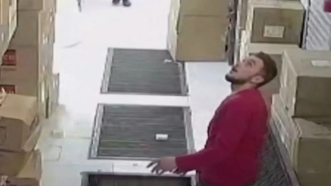 Mientras avanza, cerca suyo se encontraba un trabajador que dejaba paquetes en una bodega subterránea. De pronto, el joven dio un paso en falso y desaparece completamente de la escena al caer en un pozo que había en el piso del lugar.