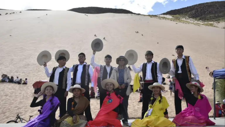Por la tarde, el esperado encuentro de danzas tuvo lugar en el imponente Cerro del Huancar. Allí se dieron cita los ballets “Achalay”, “El Huancar”, “Suyana Takiri” y “Los Halcones de la Puna”, desplegando su arte frente a un paisaje majestuoso. El clima acompañó como un verso en armonía con la celebración: una jornada serena, bañada de sol, arena y música, que envolvió a todos los presentes en una puesta en escena vibrante. Cada ballet ofreció un variado ramillete coreográfico, enriquecido por el colorido vestuario característico de la región, convirtiendo el encuentro en una verdadera fiesta cultural