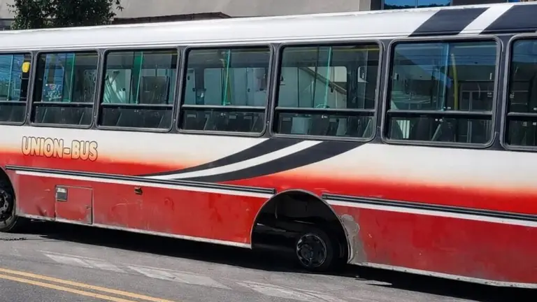 Afortunadamente, las ruedas no impactaron contra ningún otro vehículo ni contra peatones que circulaban por el lugar. El colectivo, tras perder los neumáticos, continuó avanzando unos metros más, inclinado sobre el costado afectado y dejando una marca visible en el pavimento, hasta que finalmente logró detenerse por completo.