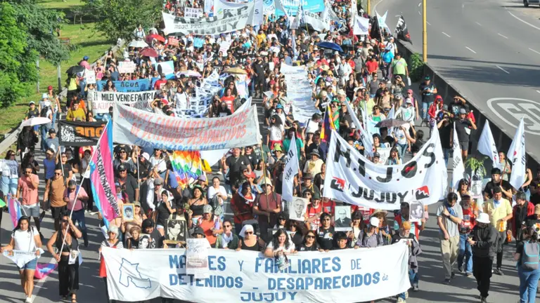 En medio de la movilización, madres y familiares de víctimas de la dictadura en Jujuy también estuvieron presentes, portando carteles y bordados con los nombres de los desaparecidos, que formaron parte central de los homenajes.