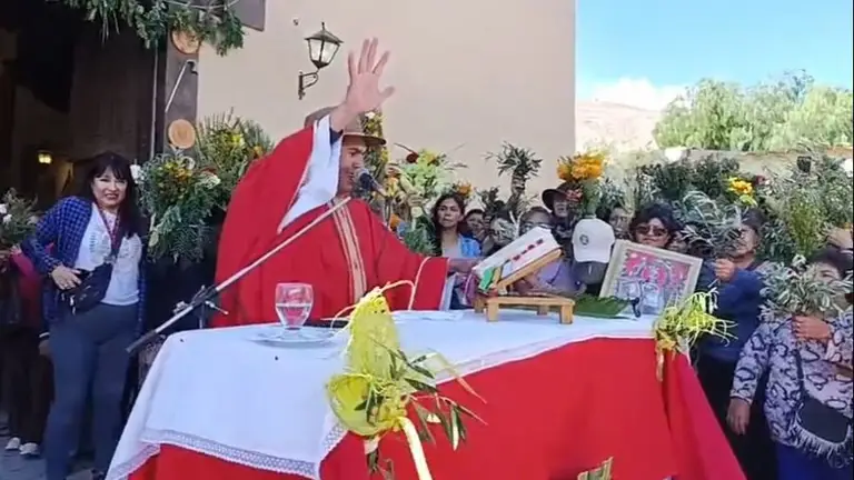 Ayer después de la celebración de la misa de inicio de Semana Santa, el párroco de Tilcara, Ricardo Rivero comenzó a bendecir a las bandas de sikuris que peregrinan al santuario de la Virgen de Copacabana del abra de Punta Corral.