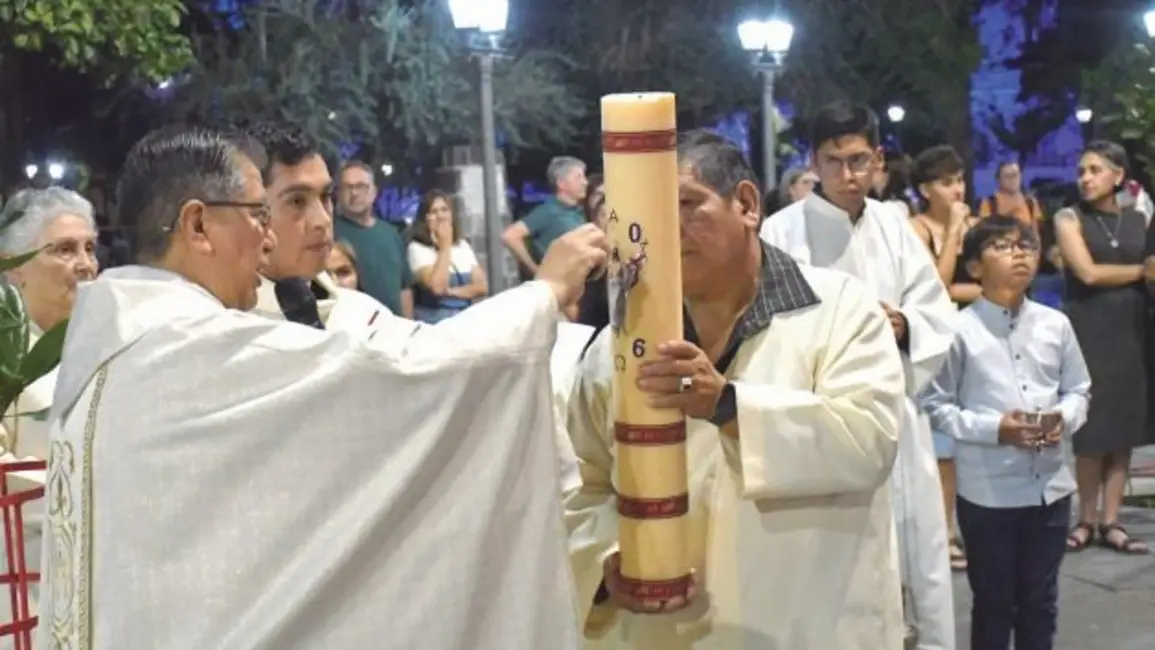 Pasadas las 20, decenas de personas se reunieron en el atrio de la iglesia homónima para vivir este conmovedor momento. La Santa Misa tuvo un inicio diferente este año, ya que el cirio pascual se encendió frente al templo, en la Plaza Belgrano, ante la vista de cientos de fieles.