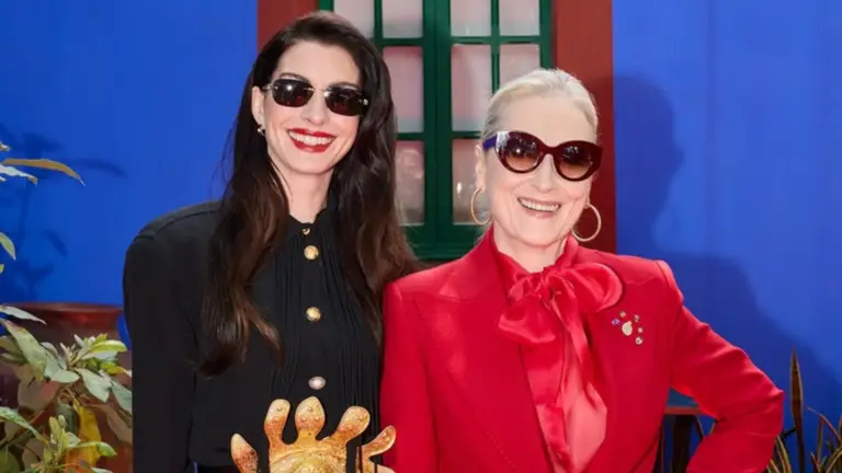 En esta ocasión, Meryl Streep deslumbró con un traje monocromático rojo, complementado con gafas de sol y un toque especial: una pequeña flor roja que evocaba a Frida Kahlo. Por su parte, Anne Hathaway optó por un conjunto negro que incluía una falda de flecos y un cinturón dorado en forma de ojo, que atrajo todas las miradas, además de accesorios de Bulgari.